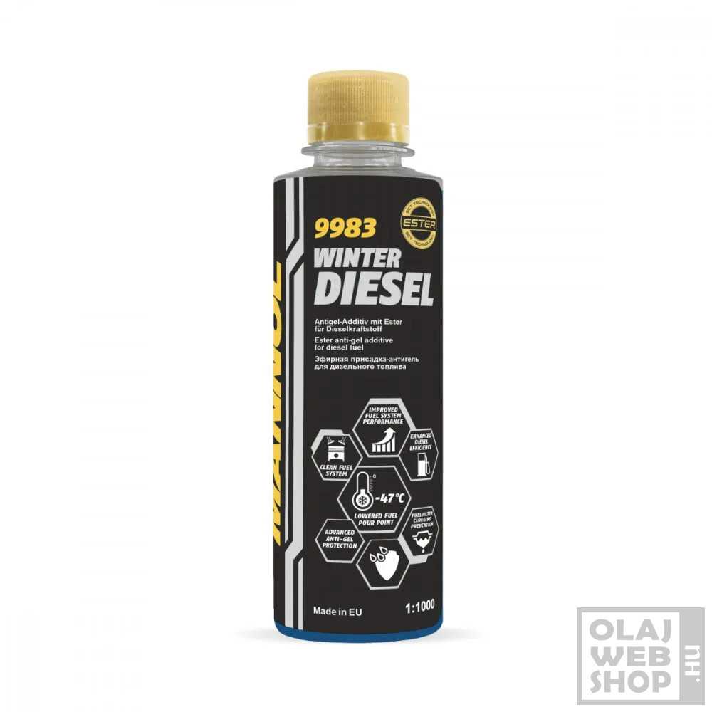 MANNOL Winter Diesel 1:1000 - egy különleges, egyedülálló technológiával kifejlesztett dermedésgátló adalék, amely csökkenti a nyári és a téli dízelüzemanyag-fajták dermedéspontját (gélesedés) és maximális szűrhetőségi hőmérsékletét. Alkalmas bármilyen típusú dízel-üzemanyaghoz és minden típusú (szívó- és turbófeltöltős) dízelmotorhoz, bármilyen üzemanyagrendszerrel, dízel részecskeszűrővel és katalizátorral felszerelve és anélkül. Nem változtatja meg az üzemanyag alapvető tulajdonságait, csak javítja annak alacsony hőmérsékletű jellemzőit.