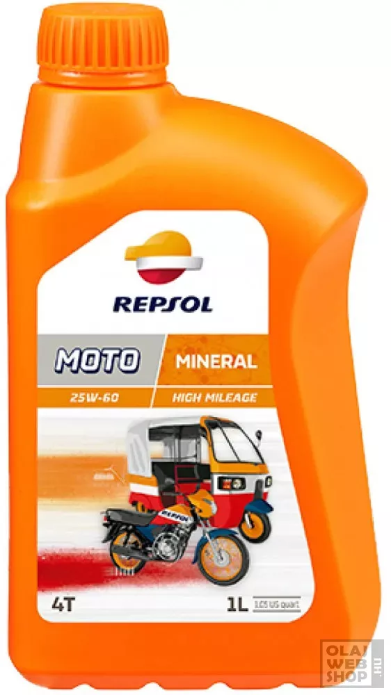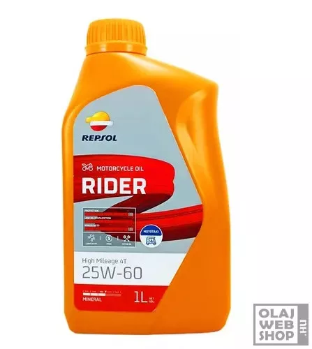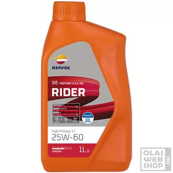 A REPSOL Rider HIGH MILEAGE 4T 25W-60 ásványi alapú kenőanyag sokat futott, négyütemű motorkerékpár-motorokhoz. Különösen ajánlott olyan öreg motorkerékpárba, kisáru-szállítókba, riksákba/”tuk-tuk”-okba, amelyek API SL, vagy alacsonyabb minőségre van szükségük.