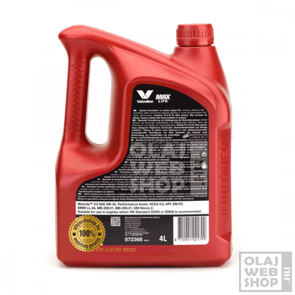 A Valvoline MaxLife C3 5W-30 egy kiváló minőségű, egyedülálló összetételű, teljes szintetikus motorolaj, amely a motor élettartamának meghosszabbítása érdekében lett kifejlesztve.
