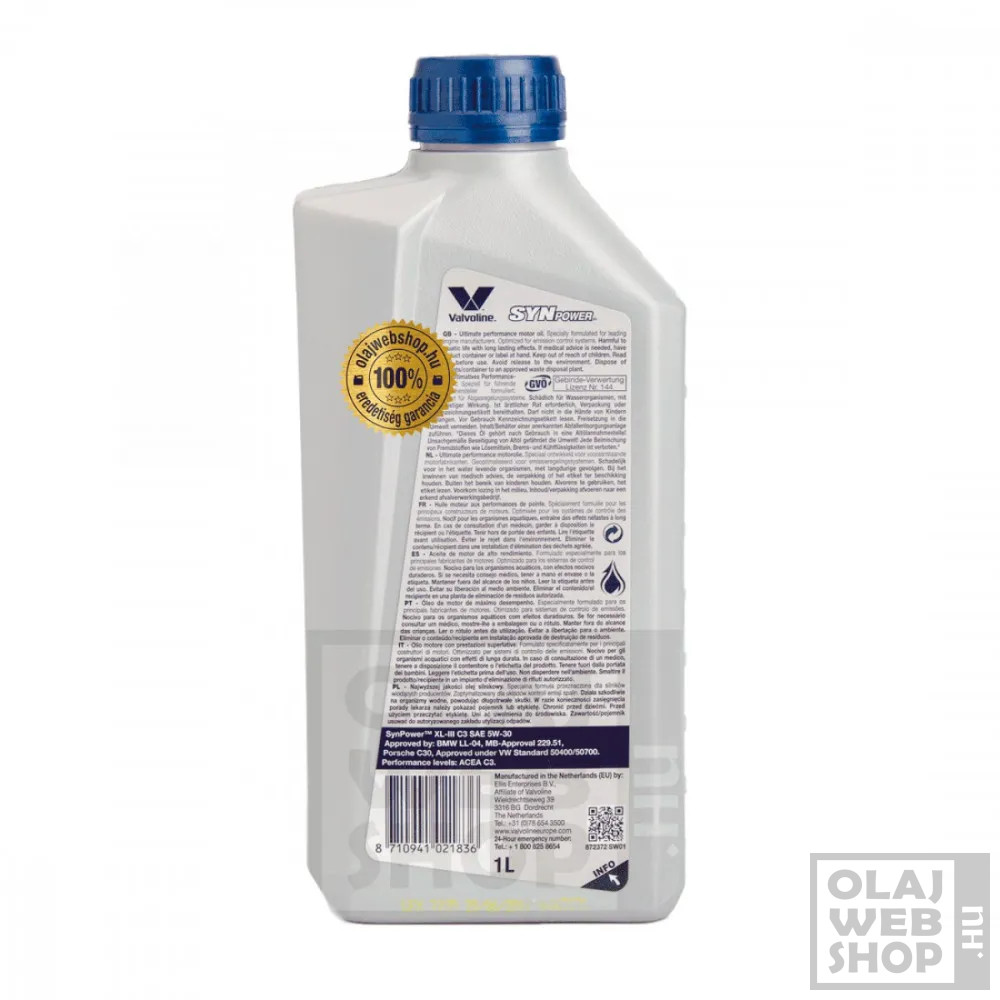 A Synpower XL-III 5W30 egy kiváló minőségű, teljesen szintetikus LongLife III motorolaj, amely elsősorban az Euro IV-es és V-ös Volkswagen motorral és diesel részecskeszűrővel (DPF) szerelt gépkocsik számára lett kifejlesztve.